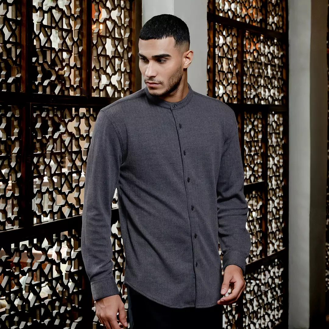 OXCON Kemeja Tangan Panjang Koko Knit Malik Collarless Shirt Grey