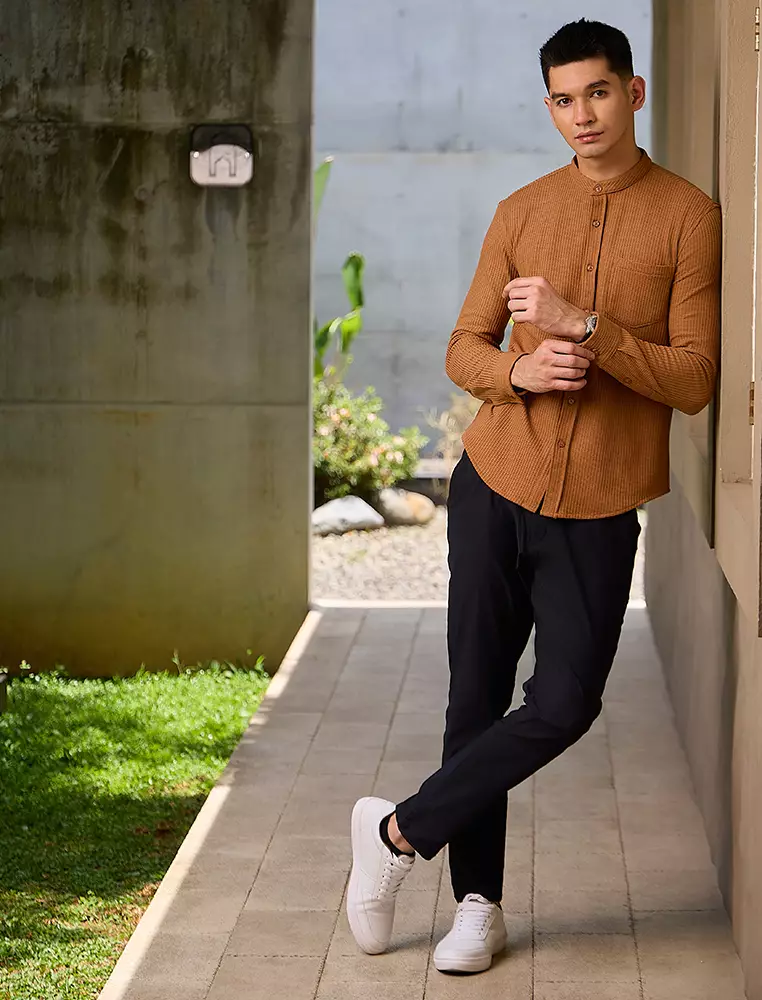 OXCON kemeja Tangan Panjang Waffle Kerah Collarless Teracotta