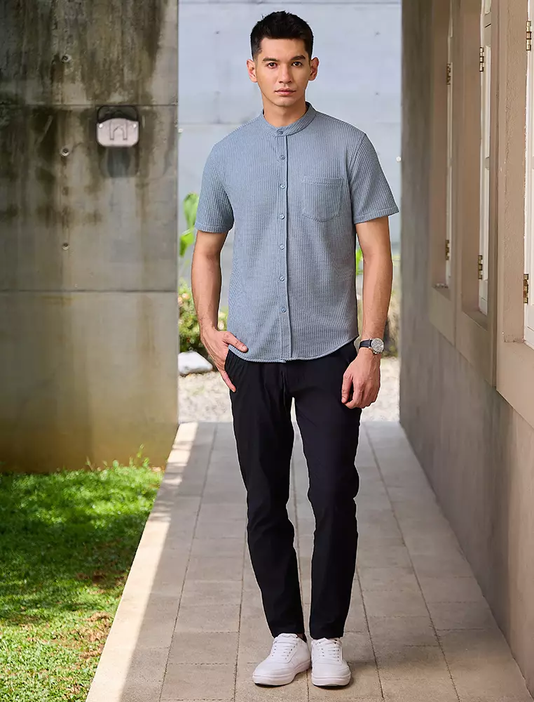 OXCON kemeja Tangan Pendek Waffle Kerah Collarless Blue Grey