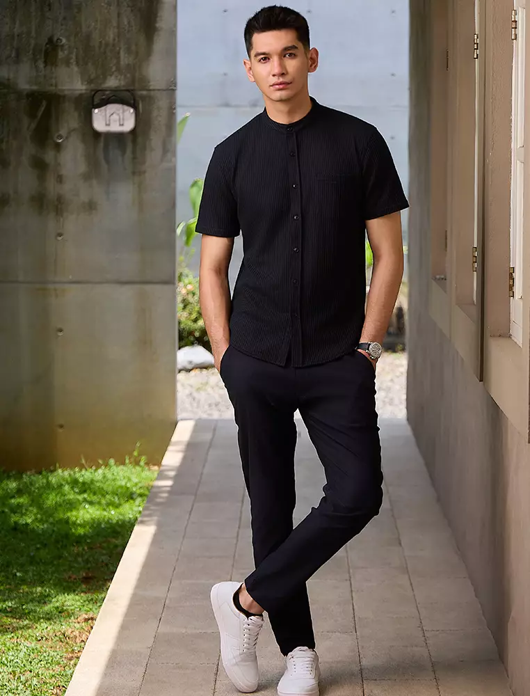 OXCON kemeja Tangan Pendek Waffle Kerah Collarless Hitam