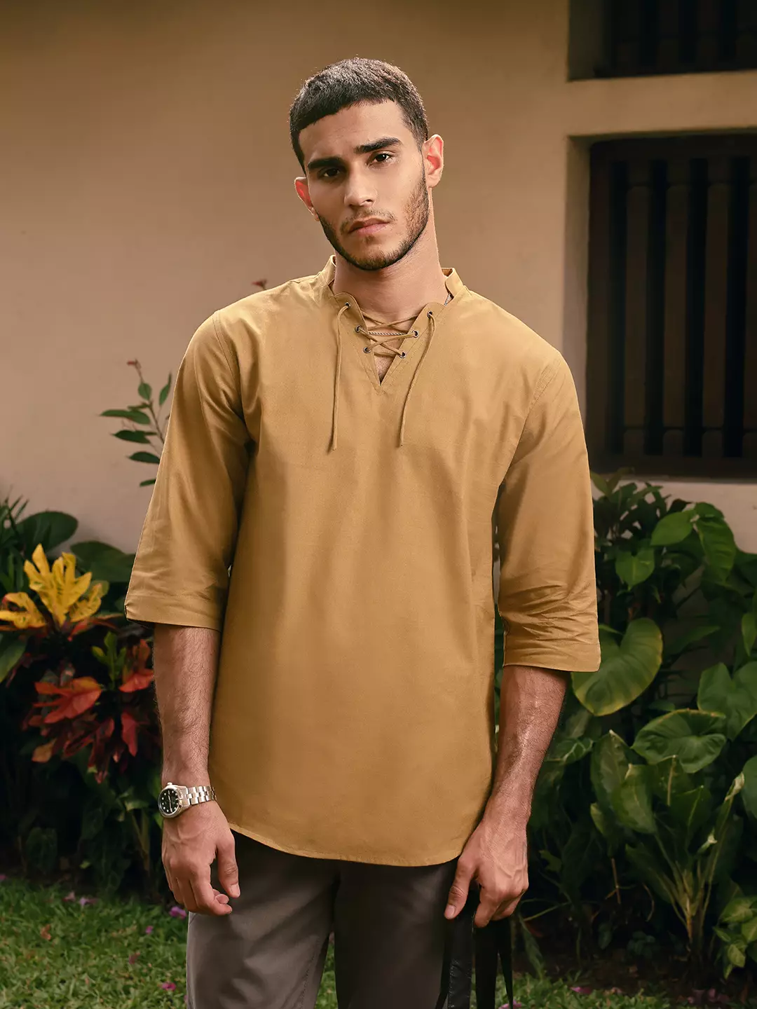 OXCON ZUHUD Kemeja koko Modern Linen Look Collarless Shirt Sand