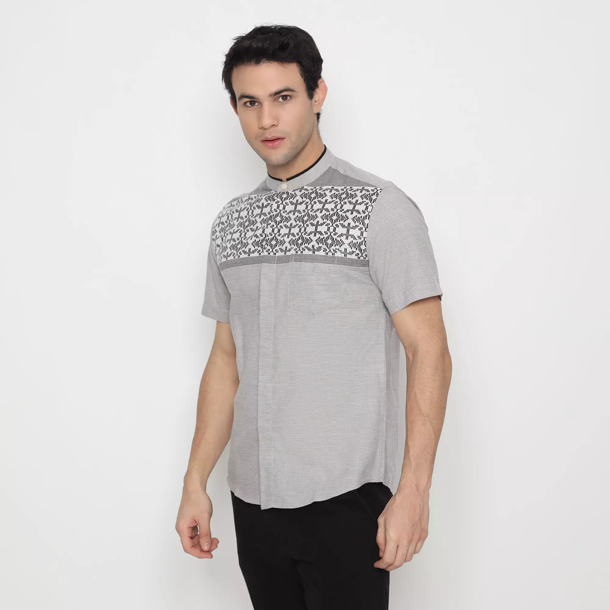 - Leher: Kerah Mandarin