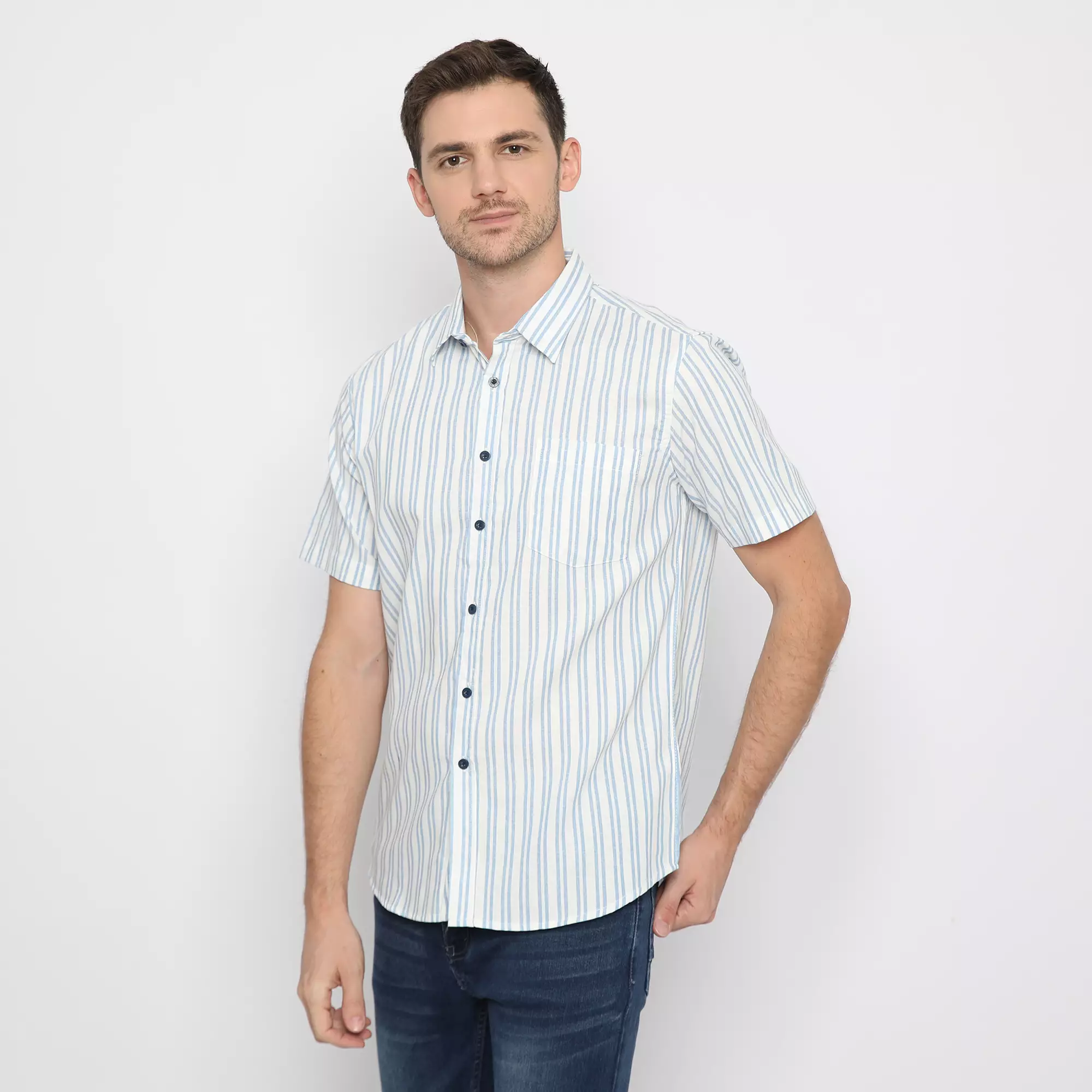 Platini Kemeja Motif Salur Pria Lengan Pendek Katun Biru Muda 73332