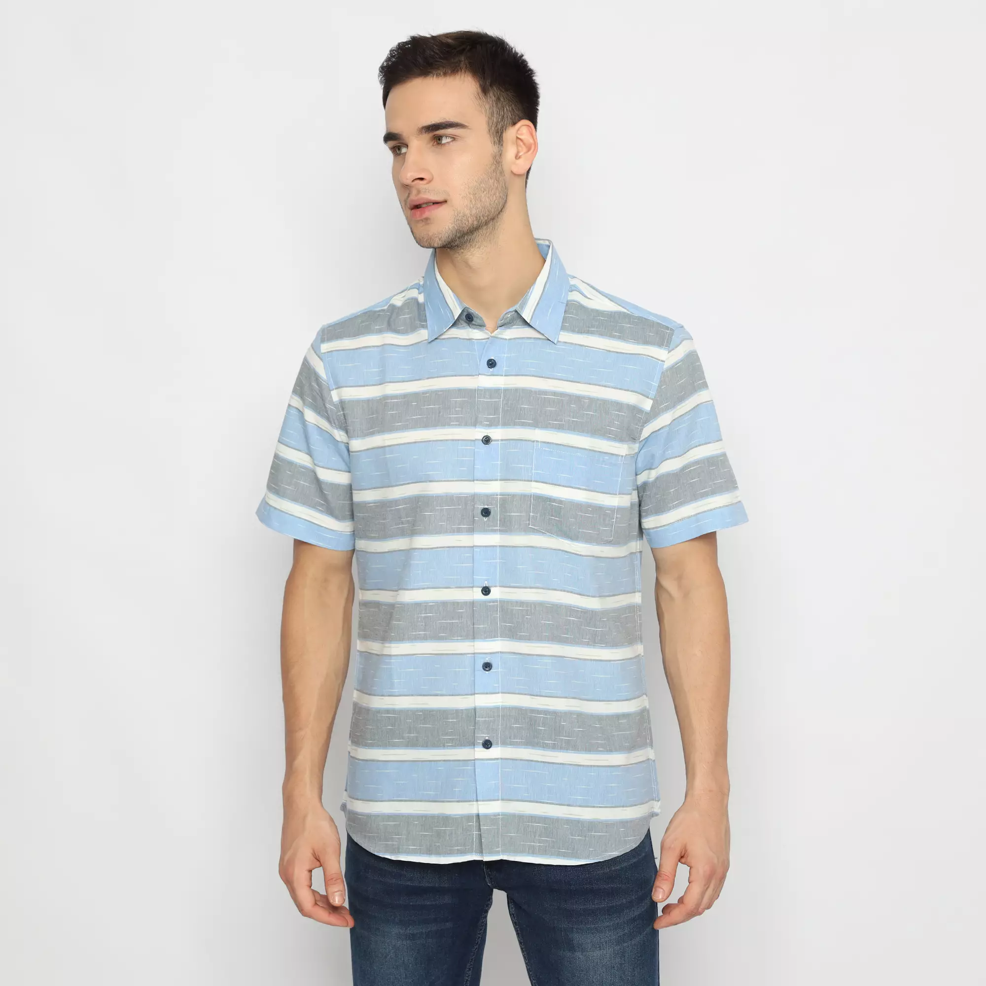 Platini Kemeja Motif Salur Pria Lengan Pendek Katun Biru Tua 73265