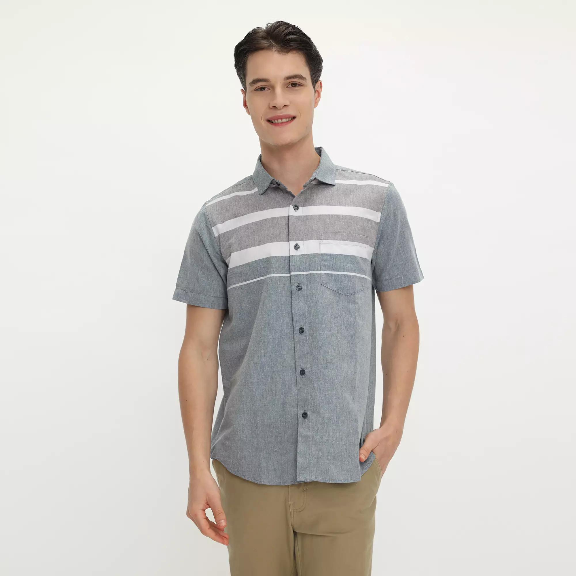 Platini Kemeja Motif Salur Pria Lengan Pendek Katun Grey 73490