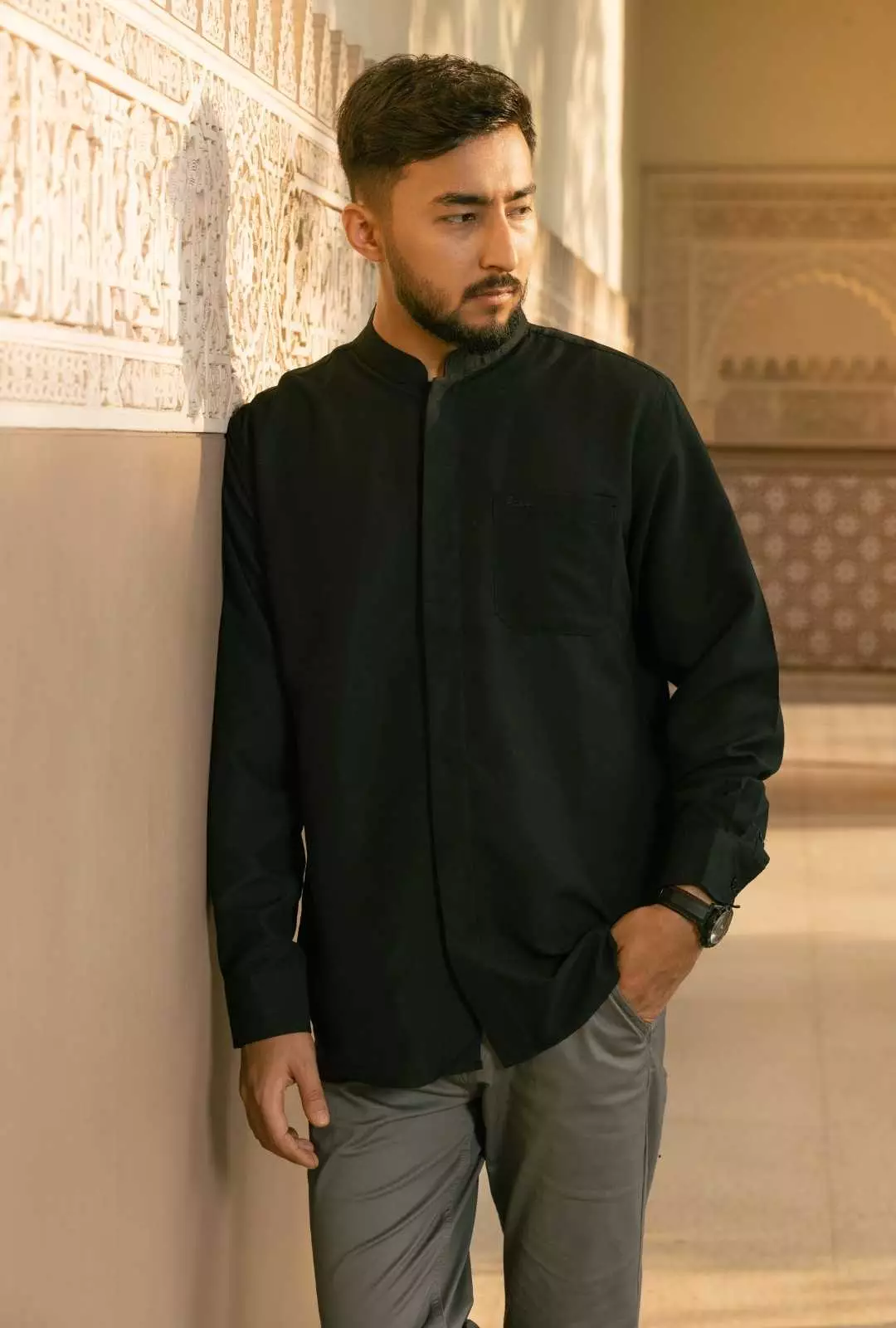POLICE Kemeja Koko Polos Cotton Soft Black Regular Fit Lengan Panjang Pria