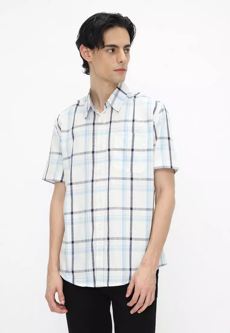 POLICE Kemeja Kotak Cotton Slub Putih Biru Regular Fit Pria