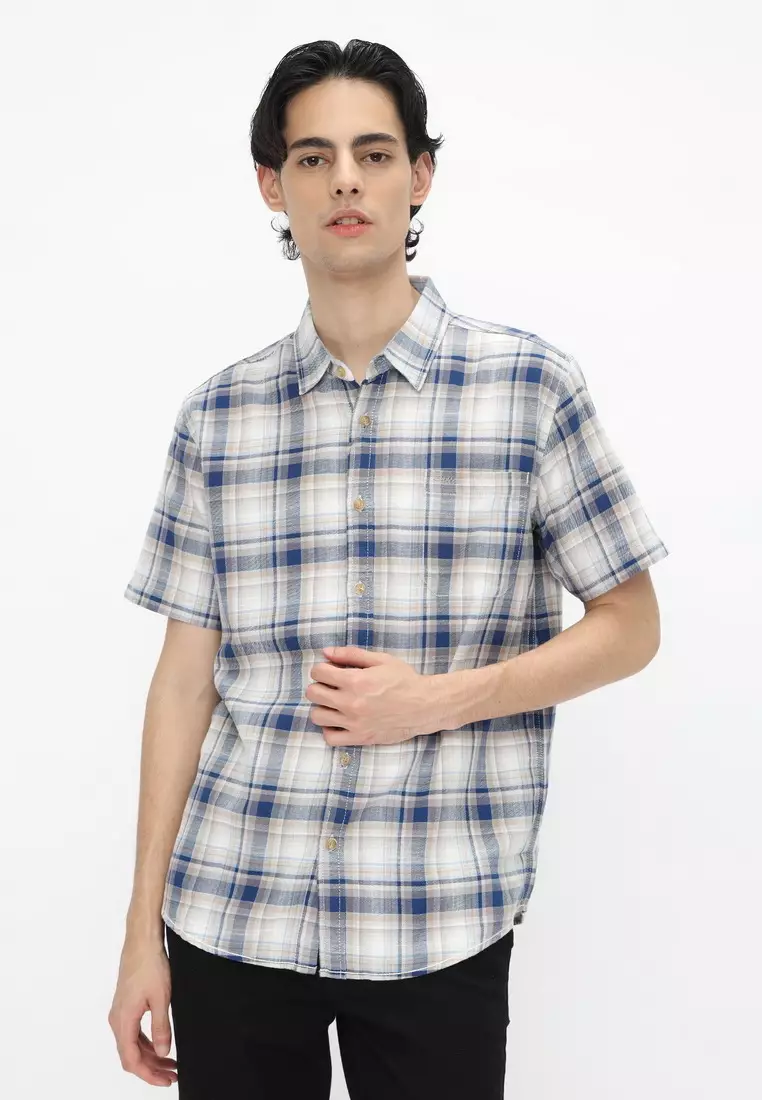 POLICE Kemeja Kotak Cotton Twill Slub Cream Biru Regular Fit Pria
