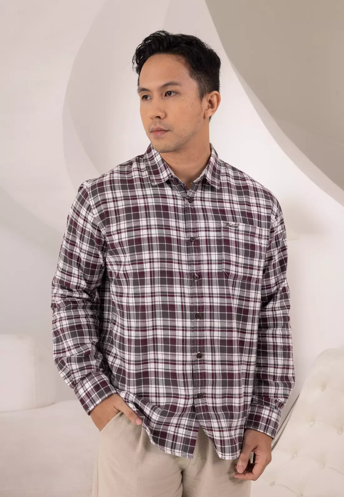 POLICE Kemeja Kotak Cotton Twill Slub Merah Biru Regular Fit Lengan Panjang Pria