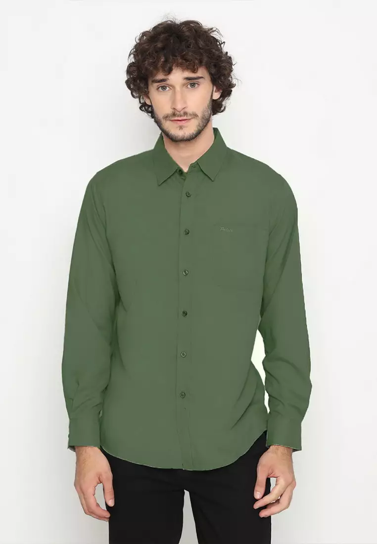 POLICE Kemeja Polos Basic Cotton Soft Olive Regular Fit Lengan Panjang Pria