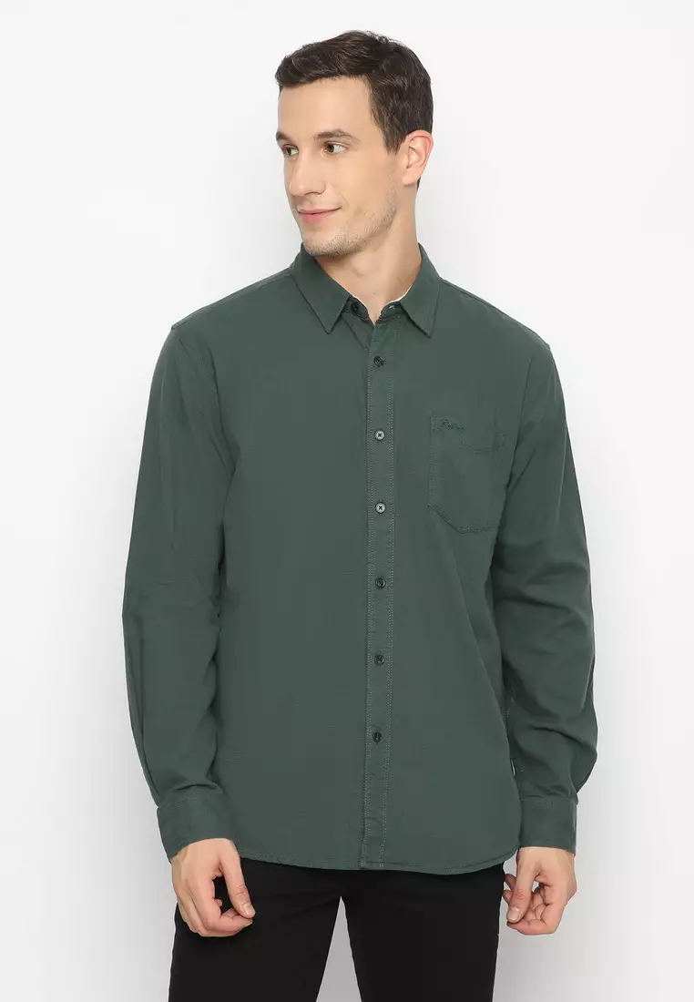 POLICE Kemeja Polos Cotton Slub Hijau Botol Regular Fit Lengan Panjang Pria