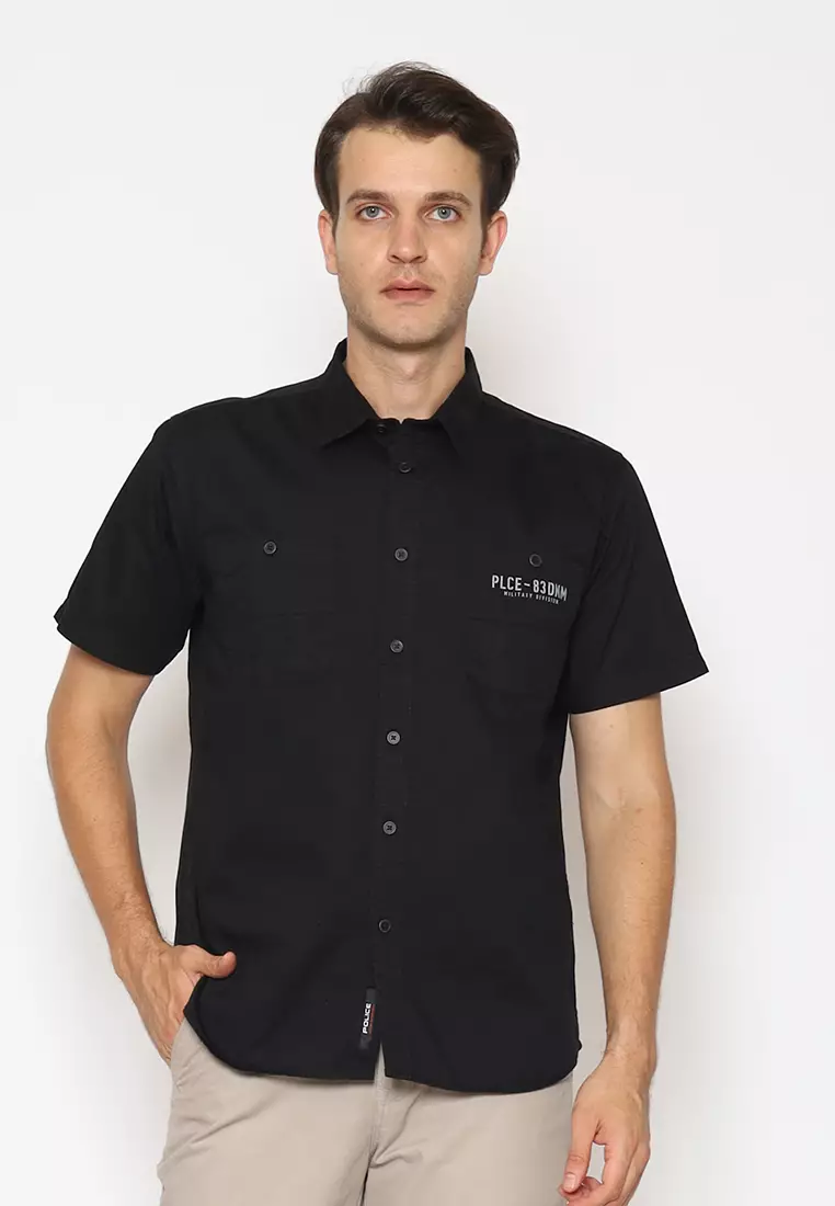 POLICE Kemeja Polos Cotton Twill Kantong Dua Black Regular Fit Pria