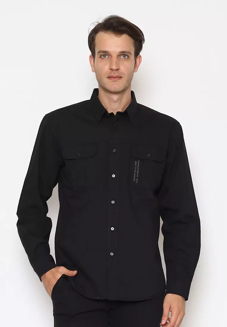 POLICE Kemeja Polos Cotton Twill Kantong Dua Hitam Regular Fit Lengan Panjang Pria