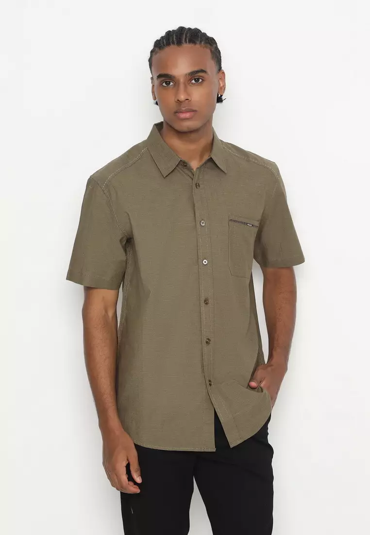 POLICE Kemeja Polos Cotton Twill Slub Hijau Army Regular Fit Pria