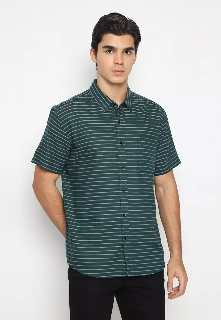 POLICE Kemeja Salur Printing Hijau Regular Fit Pria
