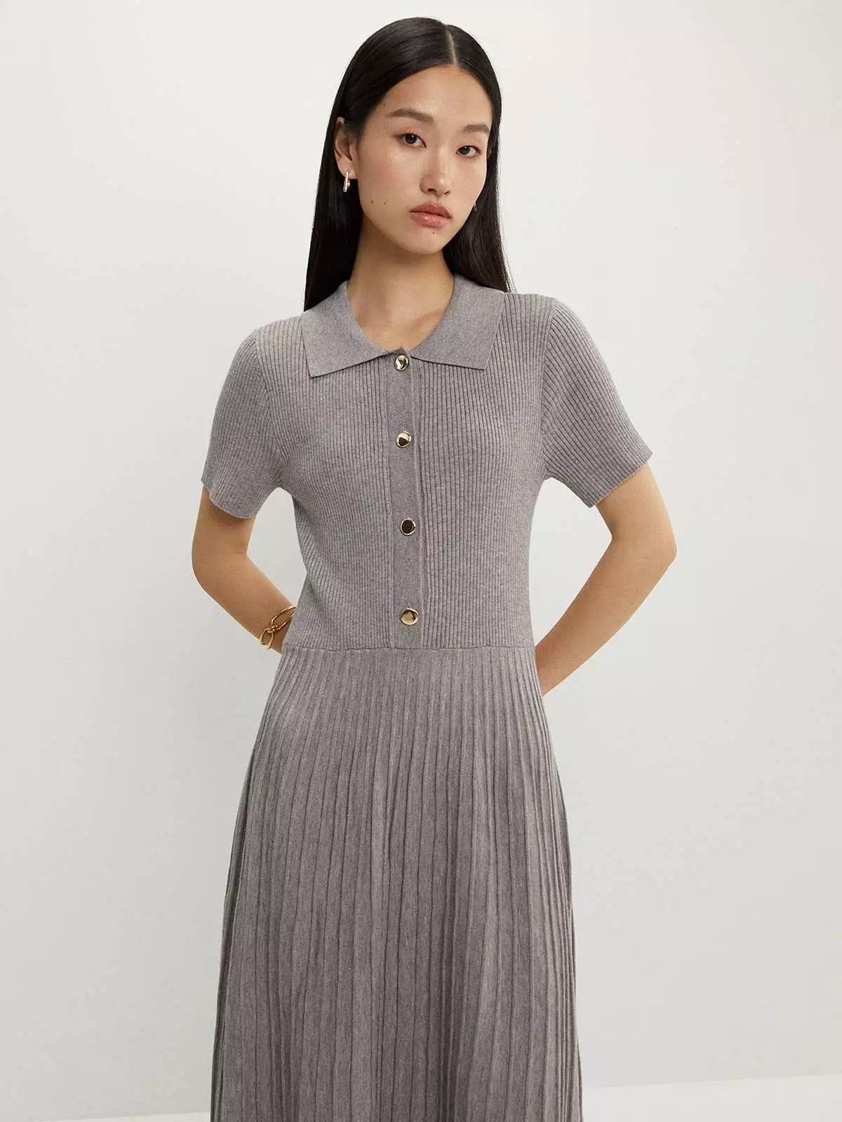 Buttoned Pleat Knit Dress - Mid Grey