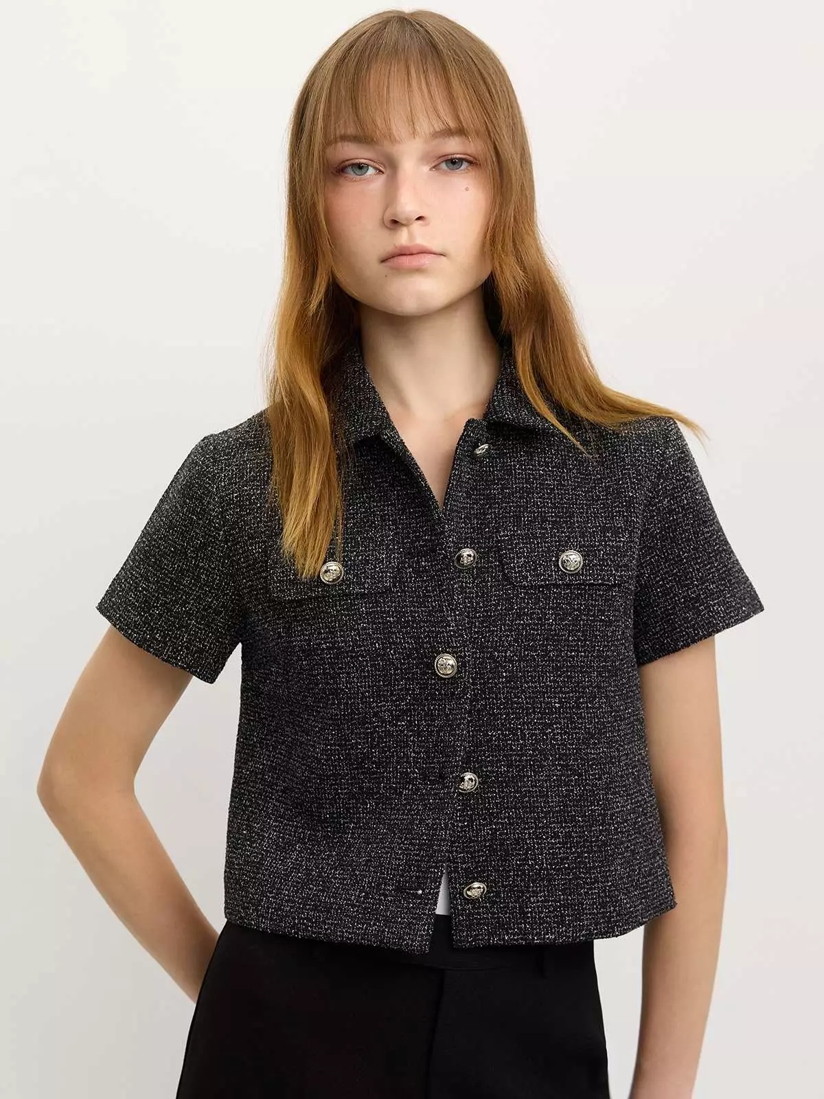 Pomelo - Kemeja / Shirt Wanita - Button-Up Crop Top - Black