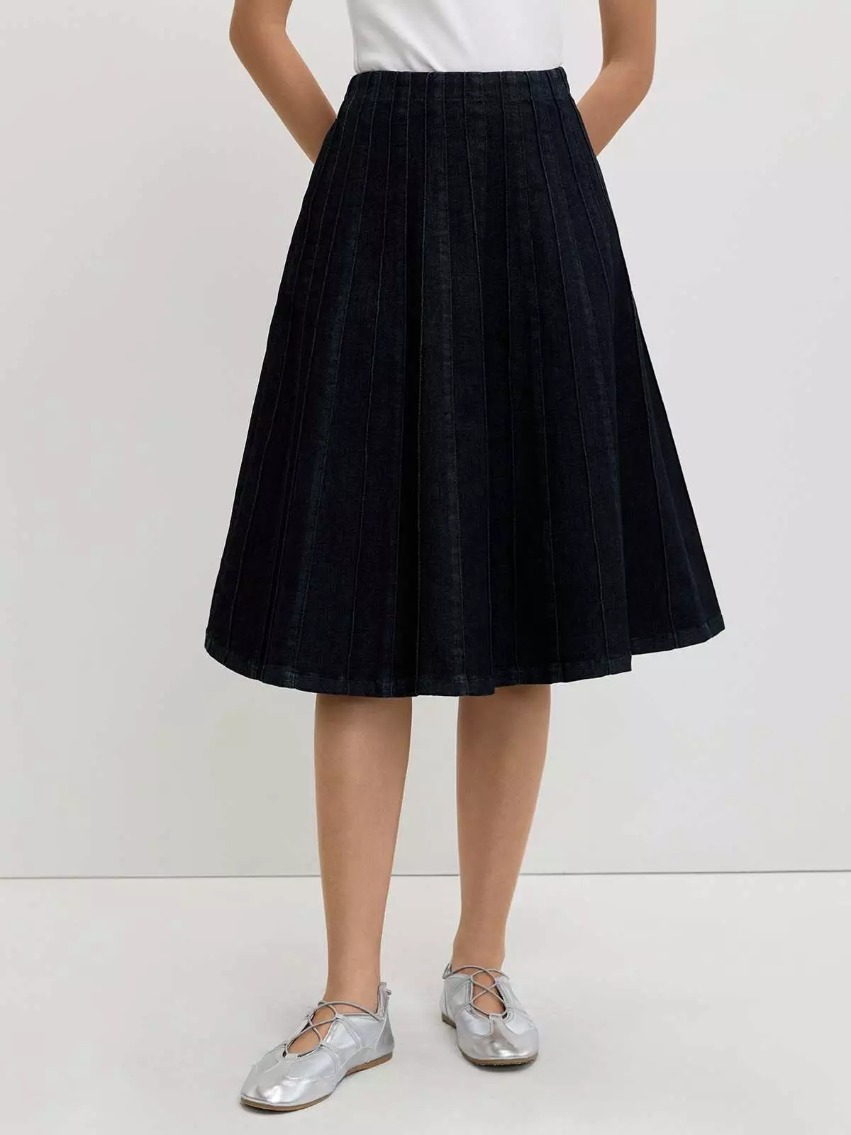 Pomelo - Rok Midi Wanita - Textured Denim Skirt - Dark Blue