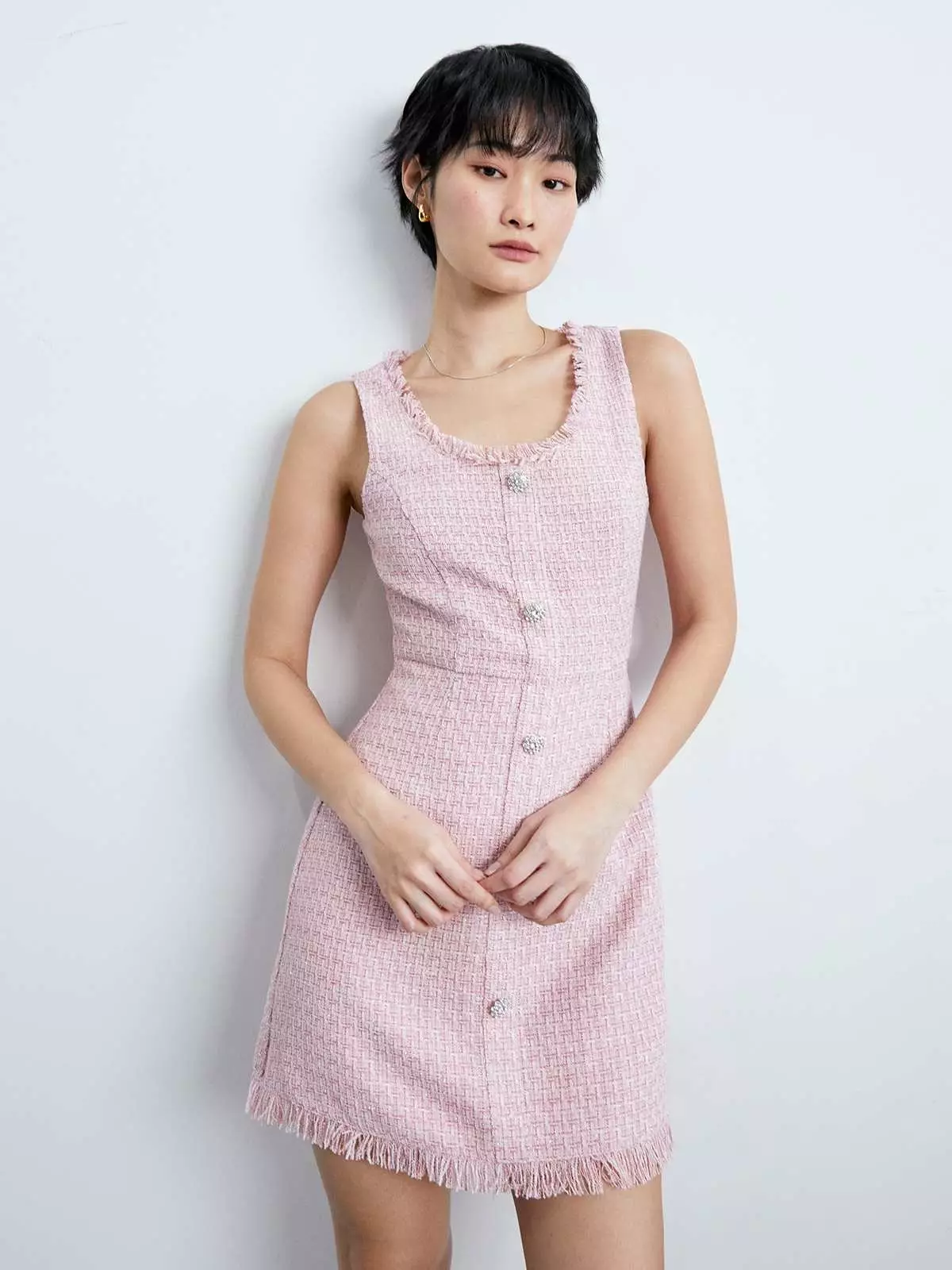 Tweed Frilled Hem Mini Dress - Pink