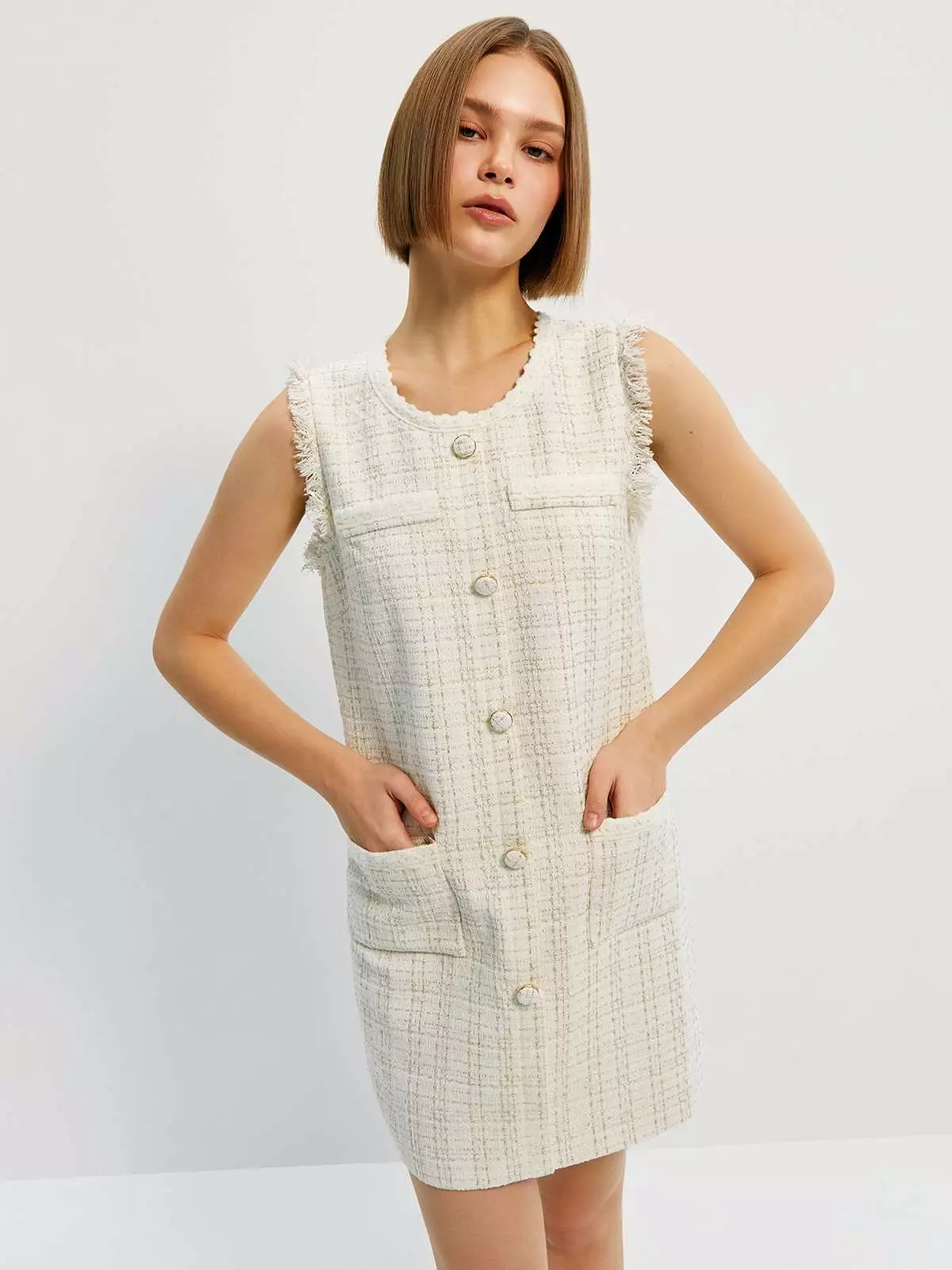Tweed Sleeveless Button Mini Dress - Cream