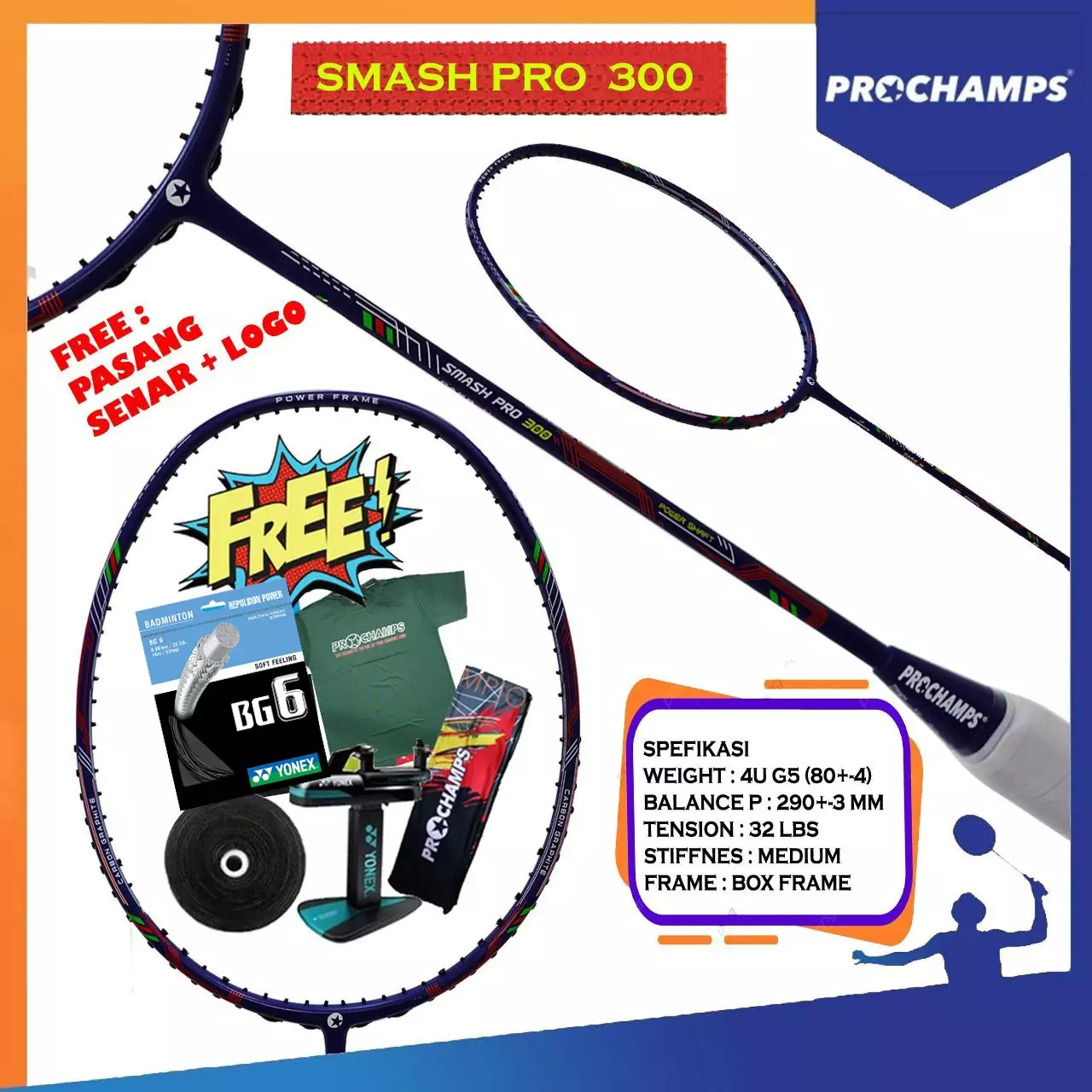 PROCHAMPS SMASH PRO 300 RAKET ORIGINAL (PAKET SENAR YONEX BG 6)