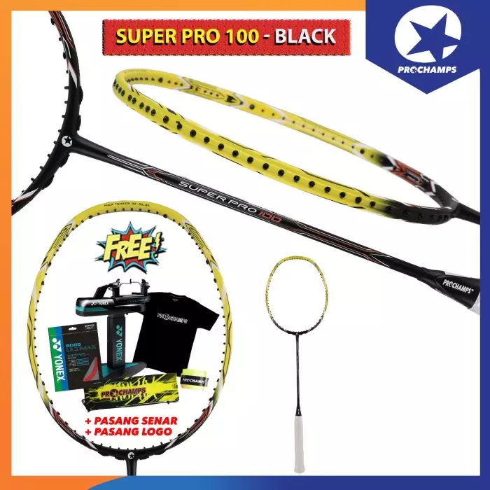 PROCHAMPS Super Pro 100 Raket Badminton Original (PAKET SENAR YONEX BG 66UM/FORCE/NN98)- BLACK