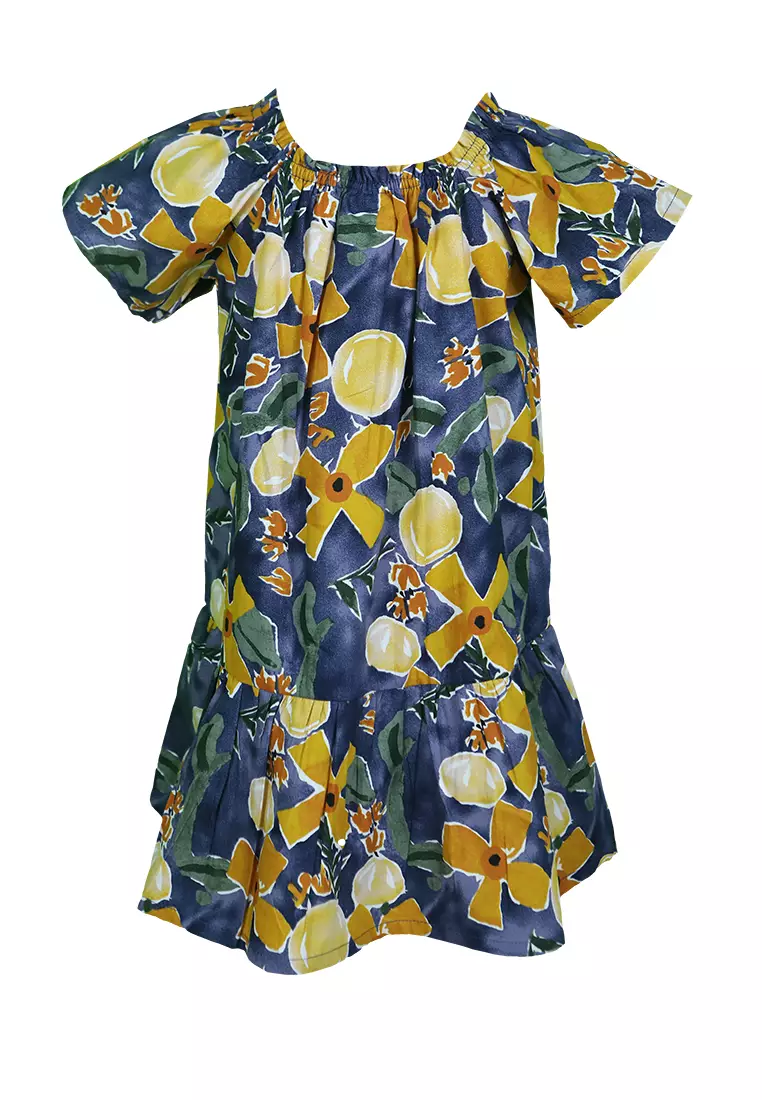 Qna Girl Joanez Midi Dress Anak Biru Motif
