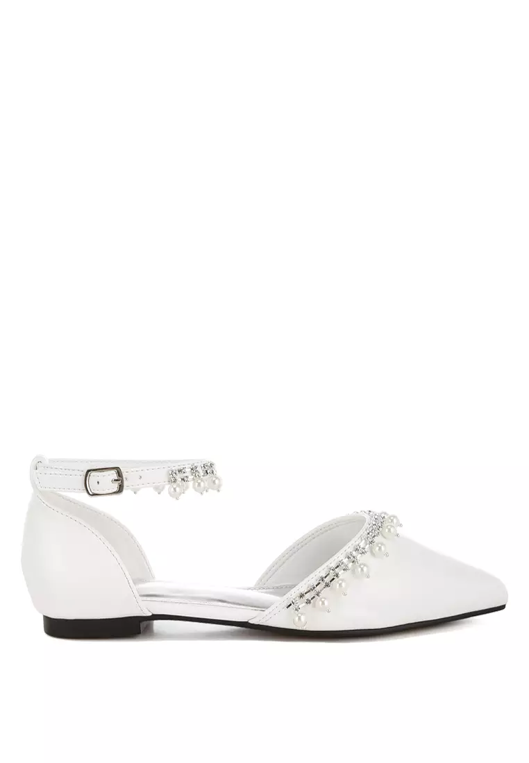 Sandal datar bertali pergelangan kaki dengan berlian imitasi dan mutiara putih