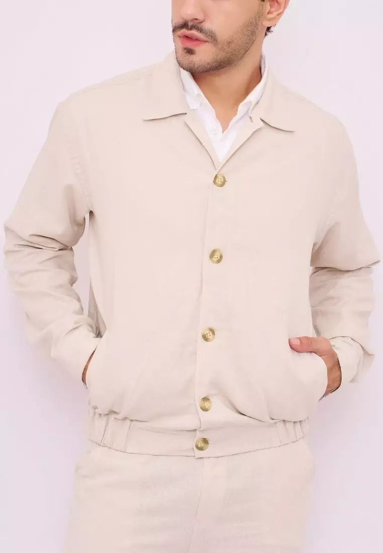 Aneto Jaket Bomber Pria Linen Warna Cream | Linen Bomber Jacket Men Cream