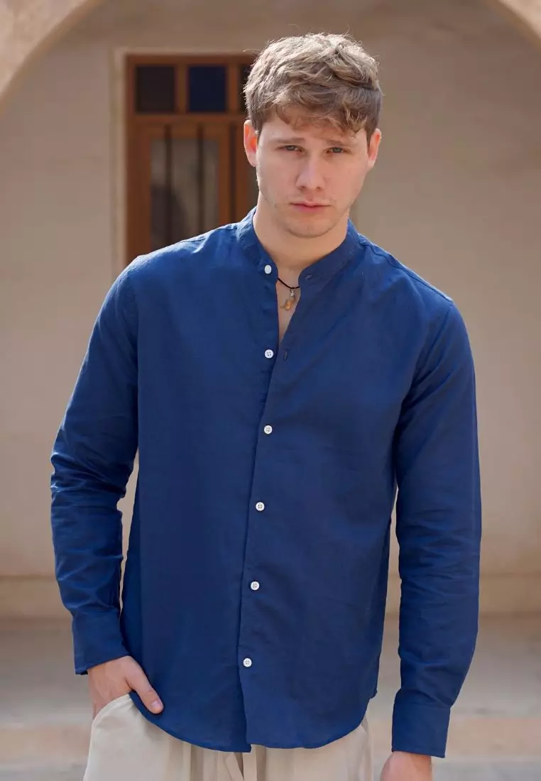 Calo Kemeja Linen Lengan Panjang Pria Biru Navy | Linen Long Sleeve Shirt Men Navy Blue