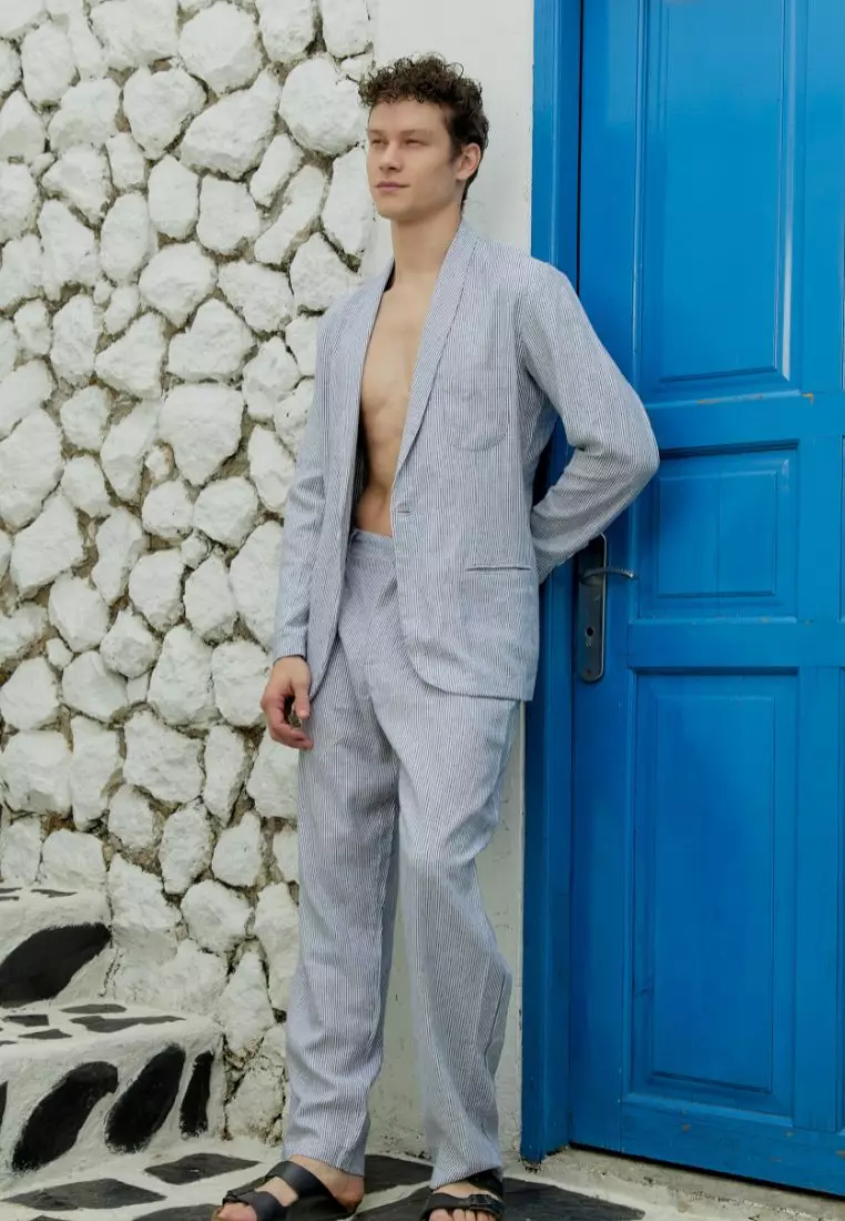 Cobalt Setelan Blazer Celana Linen Pria Abu Garis - Linen Blazer Set for Men Striped Grey
