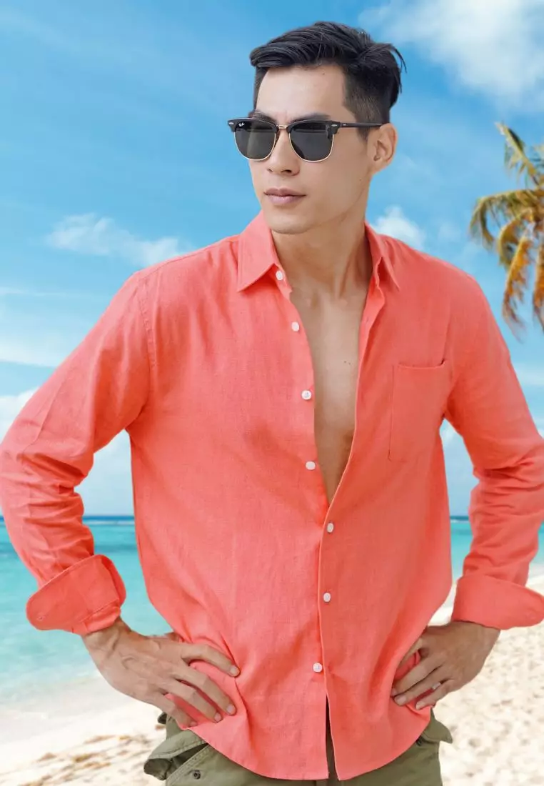 Coral Kemeja Linen Lengan Panjang Pria Merah Muda | Linen Long Sleeve Shirt Men Red