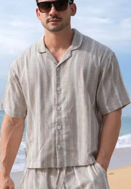Matala Kemeja Oversized Linen Bertekstur Lengan Pendek Pria Warna Cream Garis | Oversize Textured Linen Shirt Men Striped Cream
