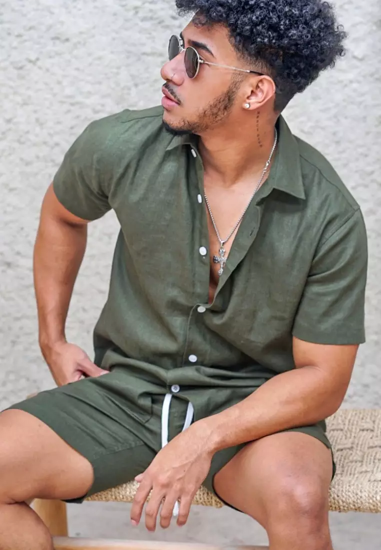 RemedyPalm Tree Kemeja Linen Lengan Pendek Pria Hijau Army | Linen Short Sleeve Shirt Men Army Green389000.00