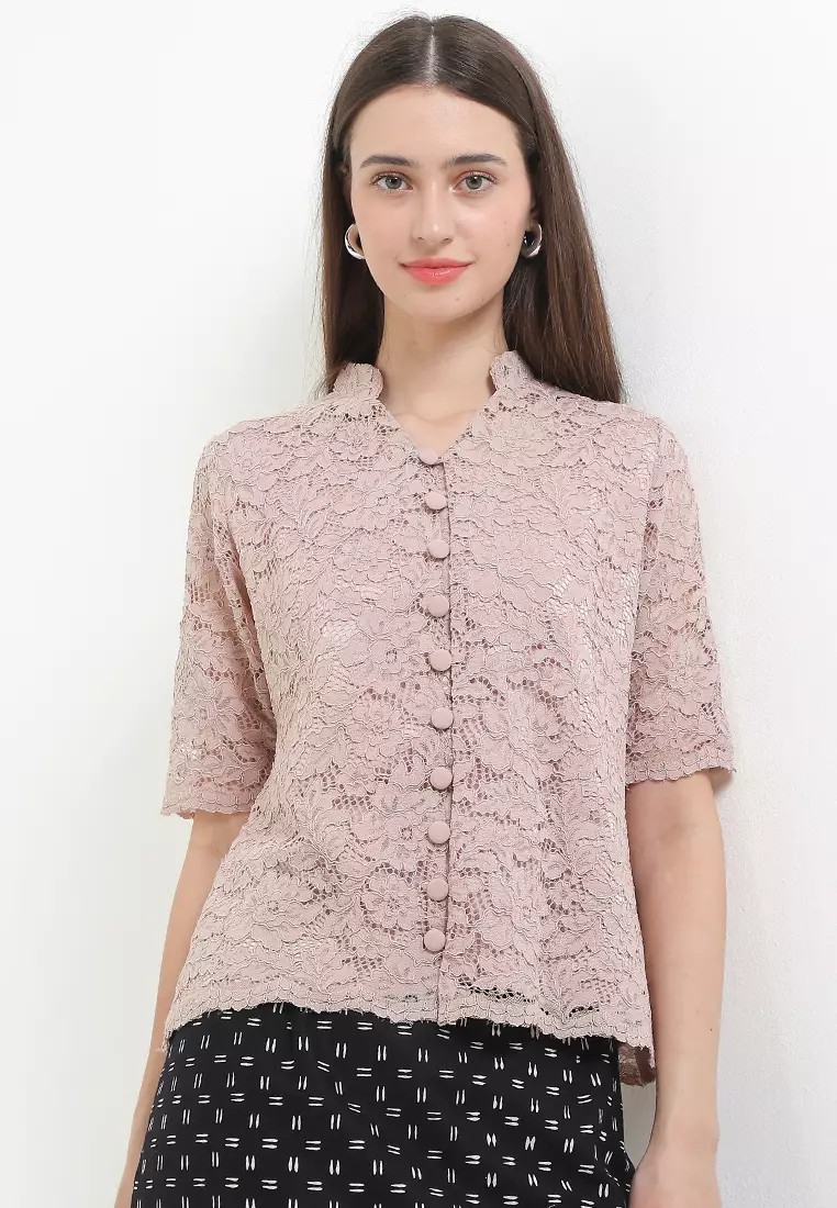 Blouse Kebaya Atasan Brokat Wanita Batik Kerja Casual Formal Lining Furing Keyva Lavender Lengan Pendek