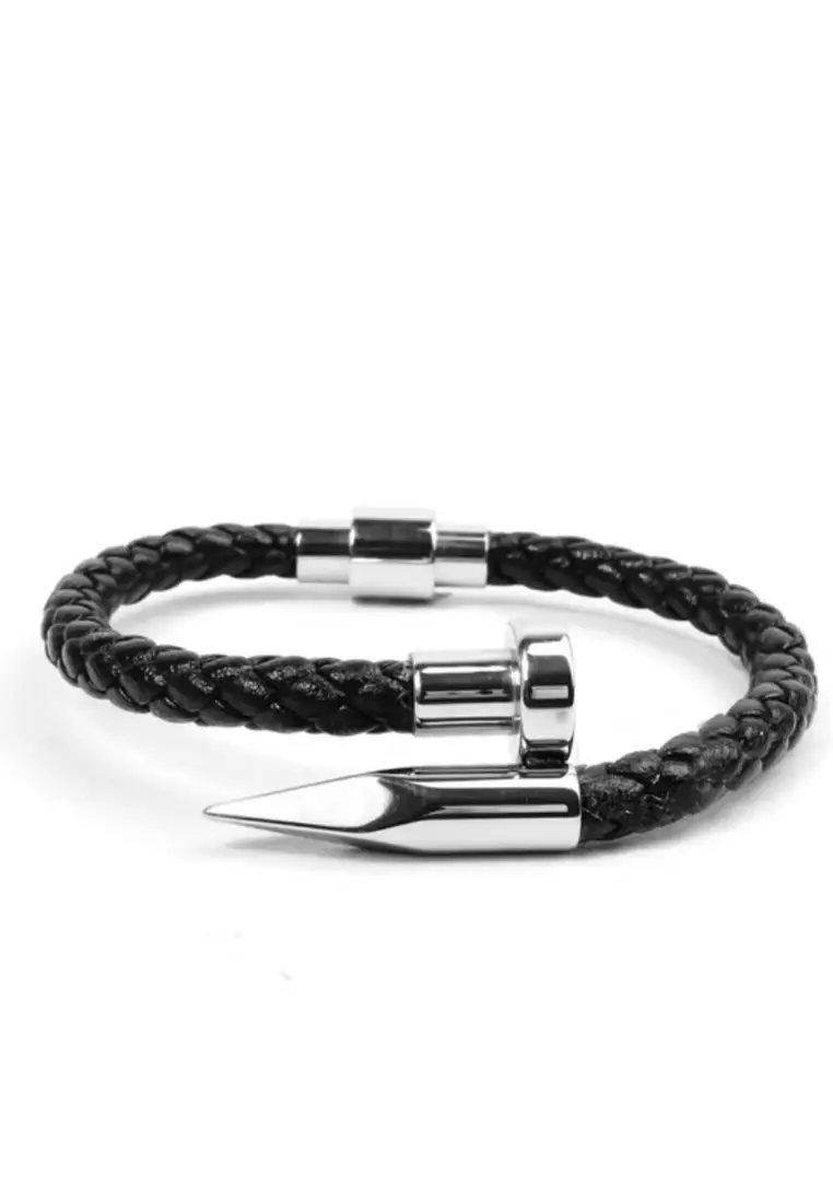 Accessories Pria Stainless Nail Design Center Leather Bracelet Gelang Pria Black & Silver