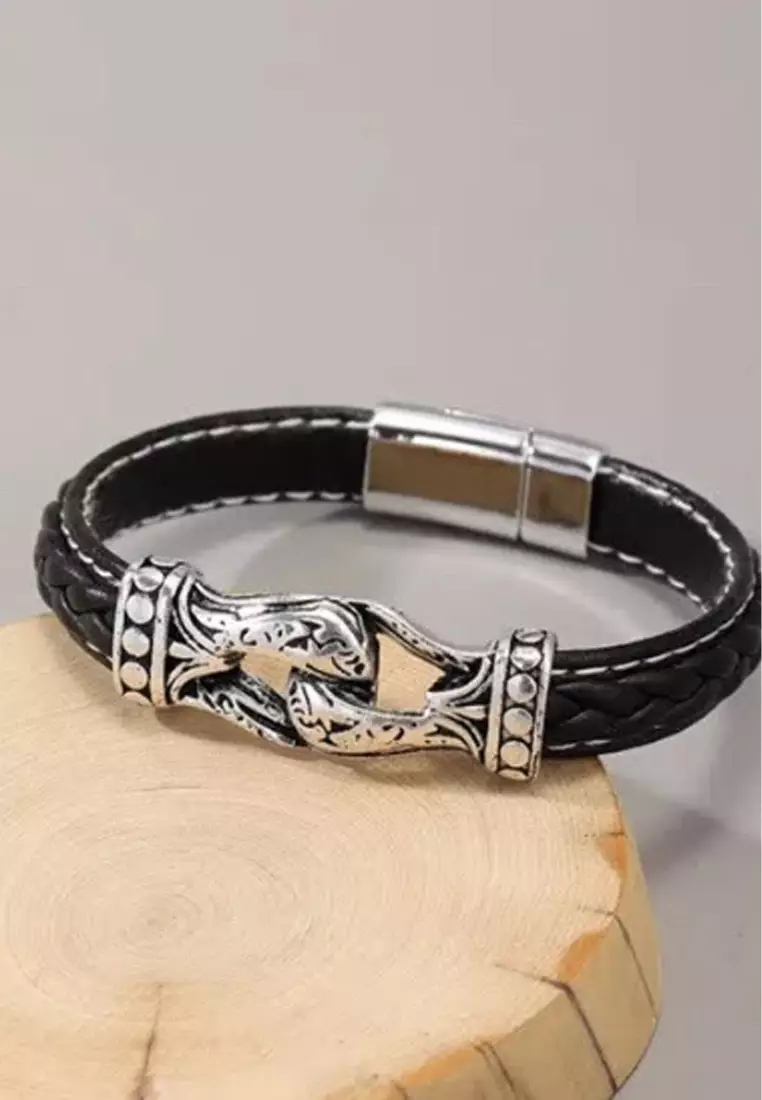 Accessories Pria Stainless Steel Knot Design Center Leather Bracelet Gelang Pria Black & Silver