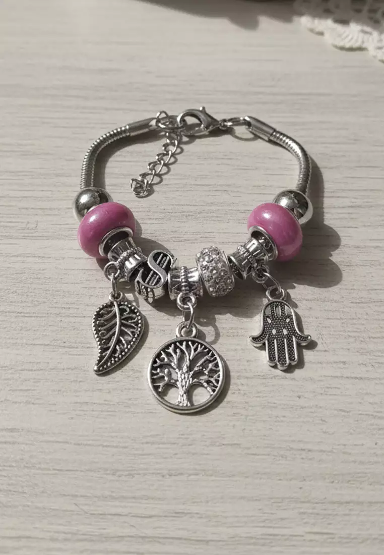 Accessories Wanita Tree Of Life Hamza Protective Hand Pomora Charm Bracelet Gelang Wanita Silver & Pink