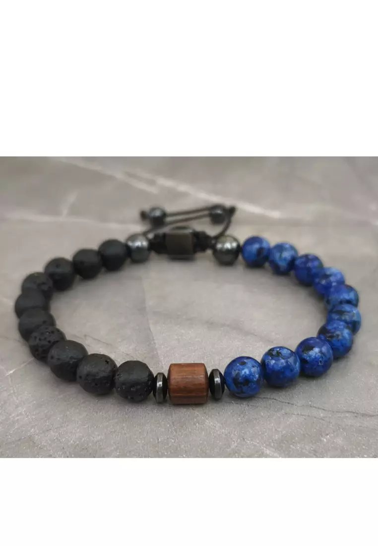 Aksesoris Gelang Pria Macrame Wooden Stump Center Lapiz & Lava Stones Bracelet Black & Lapiz