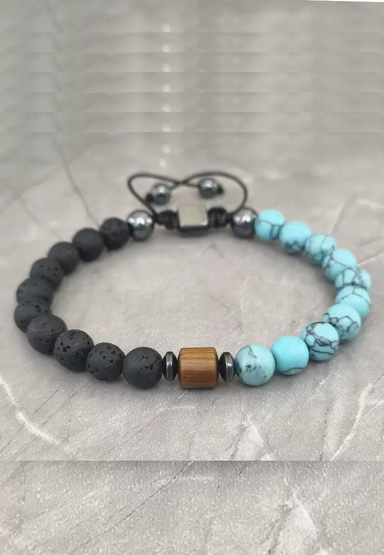Aksesoris Gelang Pria Macrame Wooden Stump Center Turqouise & Lava Stones Bracelet Black & Turqouise