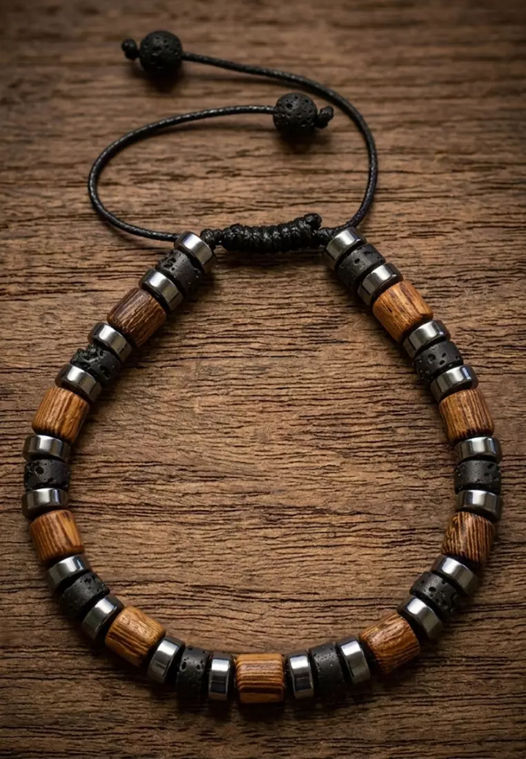 Aksesoris Gelang Pria Wooden & Lava Beads Bracelet Black, Brown & Silver