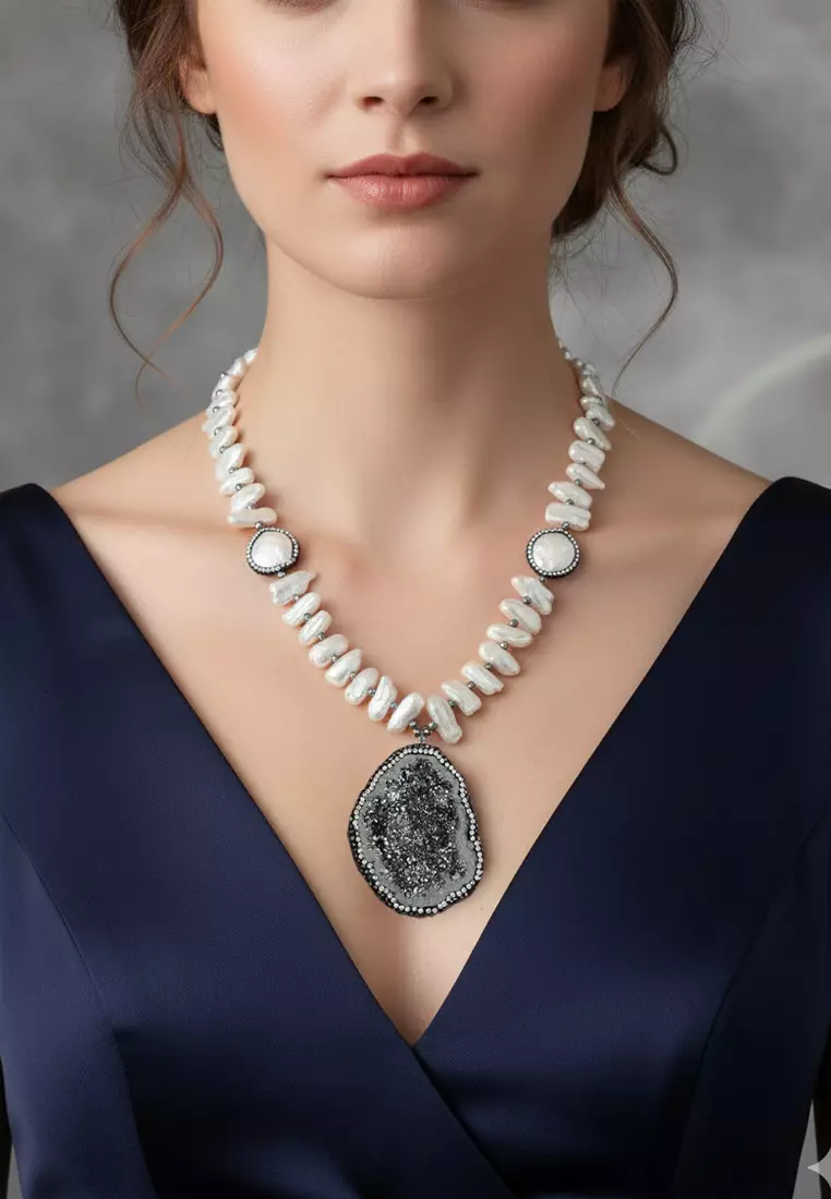 Aksesoris Kalung Wanita Drusy Quartz geode Pendant Pearls Necklace Kalung Wanita Grey & White