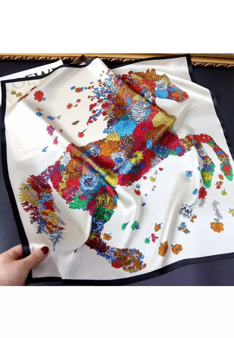 Aksesoris Scarf Floral Horse Print Motif Silky Square Satin Scarf Segi Empat Ukuran Kecil White & Multi