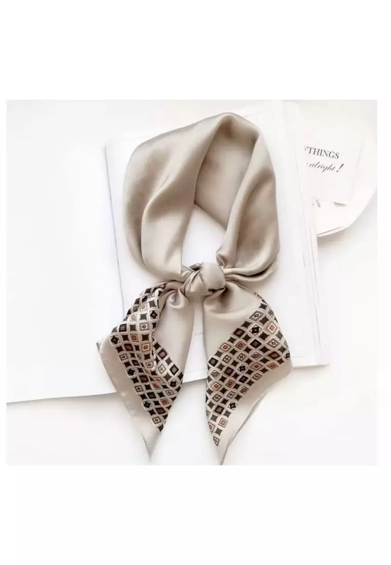 Aksesoris Scarf Wanita Monogram Border Motif Silky Square Satin Scarf Segi Empat Ukuran Kecil Nude Beige