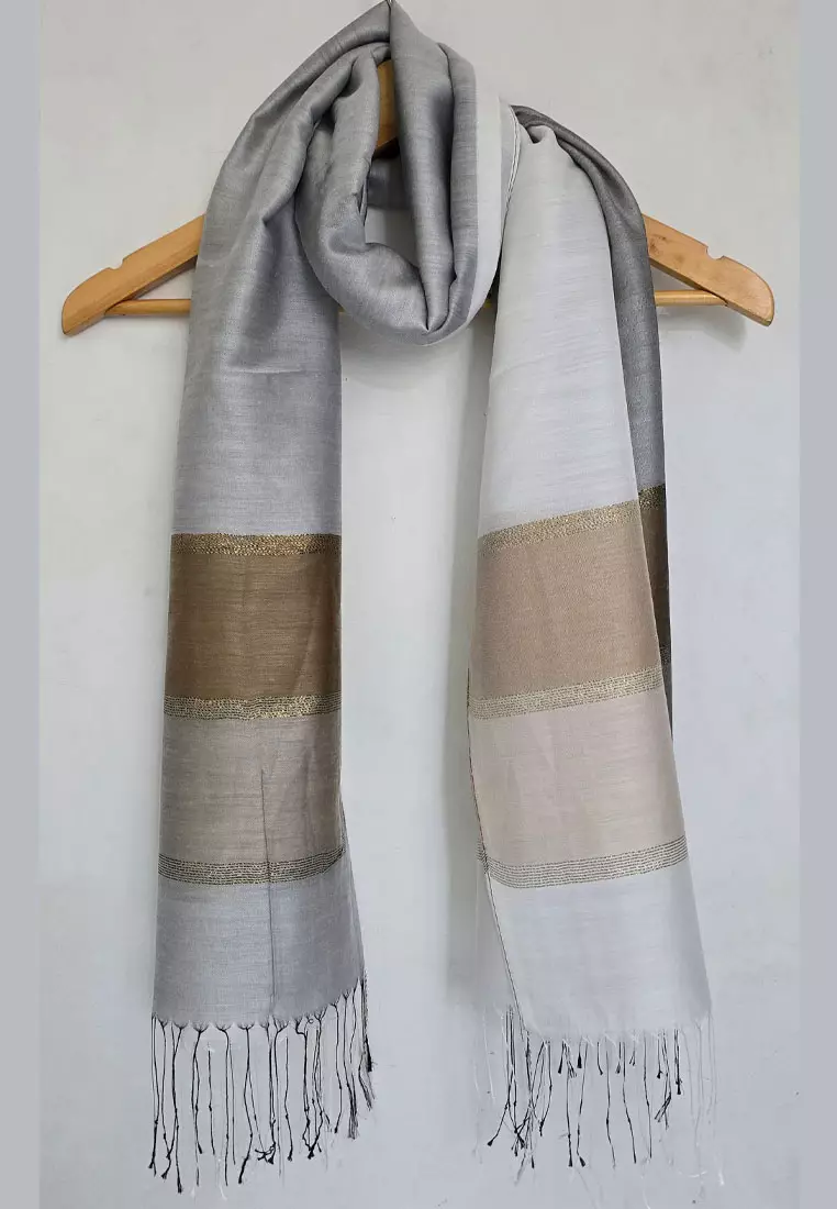 Aksesoris Scarf Wanita Raw Silk Stripes Border Shawl Syal Sutra Wanita Silver & White