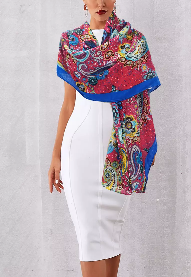 Aksesoris Syal Wanita Paisley Pattern Poly Printed Pashmina Scarf Pink & Blue