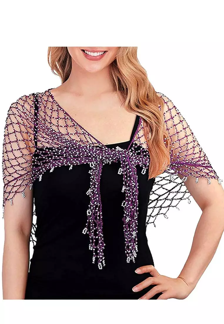Aksesoris Wanita Beaded Triangle Scarf Segitiga Syal Wanita Purple & Silver