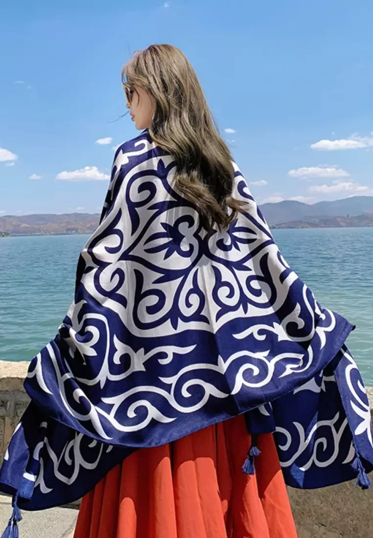Aksesoris Wanita Boho Style Pattern Tassels Viscose Shawl Syal Wanita Blue