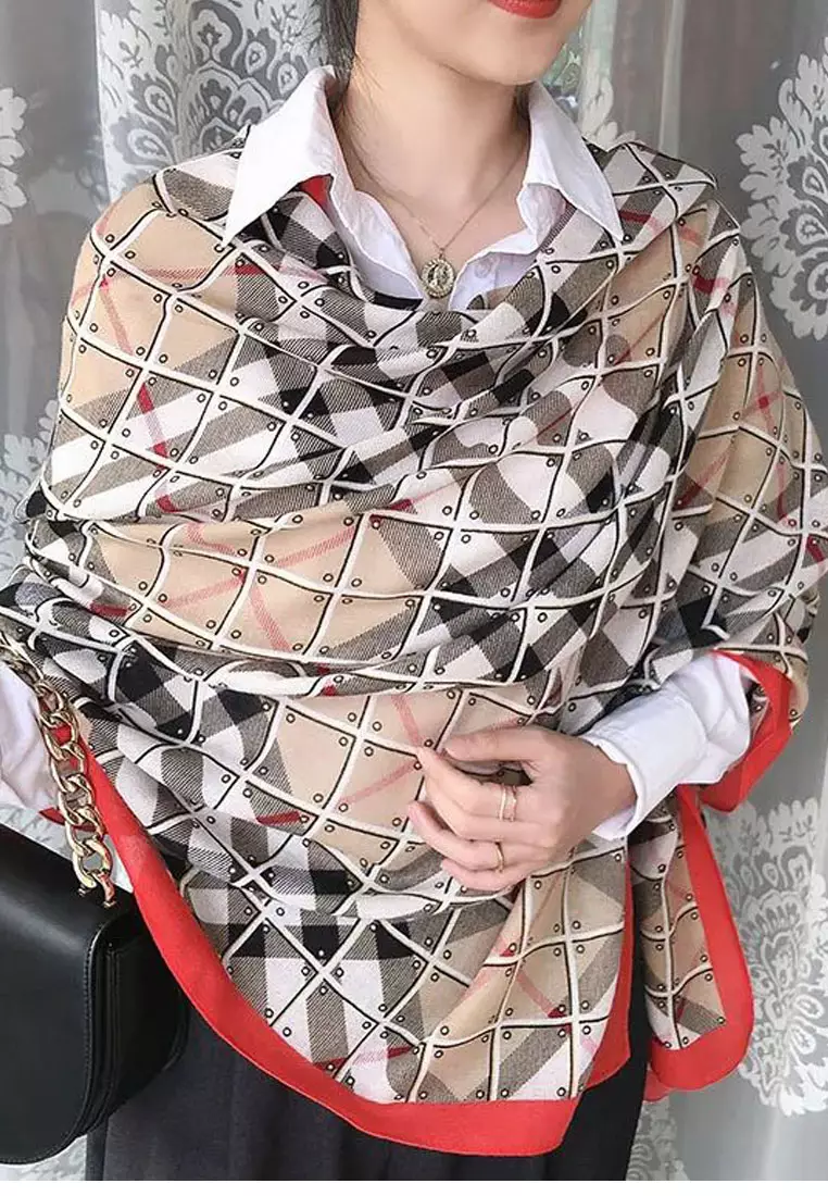 Aksesoris Wanita Checkered Pattern Viscose Shawl Syal Wanita Solid Border Beige & Red