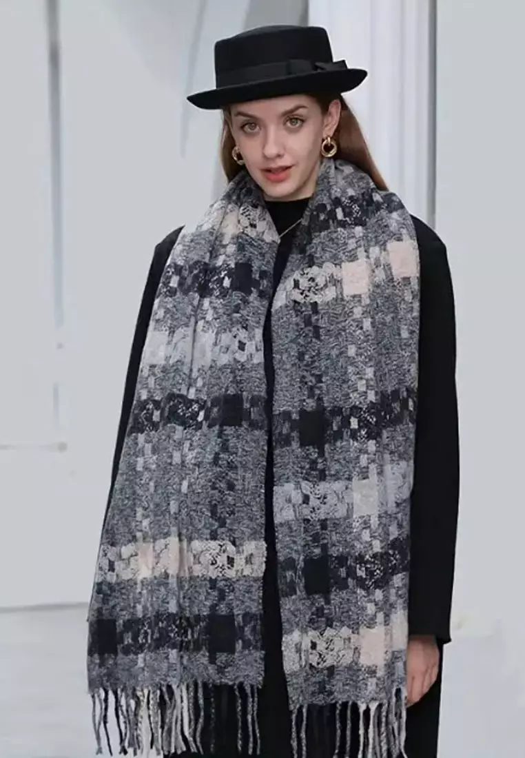 Aksesoris Wanita Checks Motif Cashmere Pashmina Syal Wanita Tebal Kasmir Black
